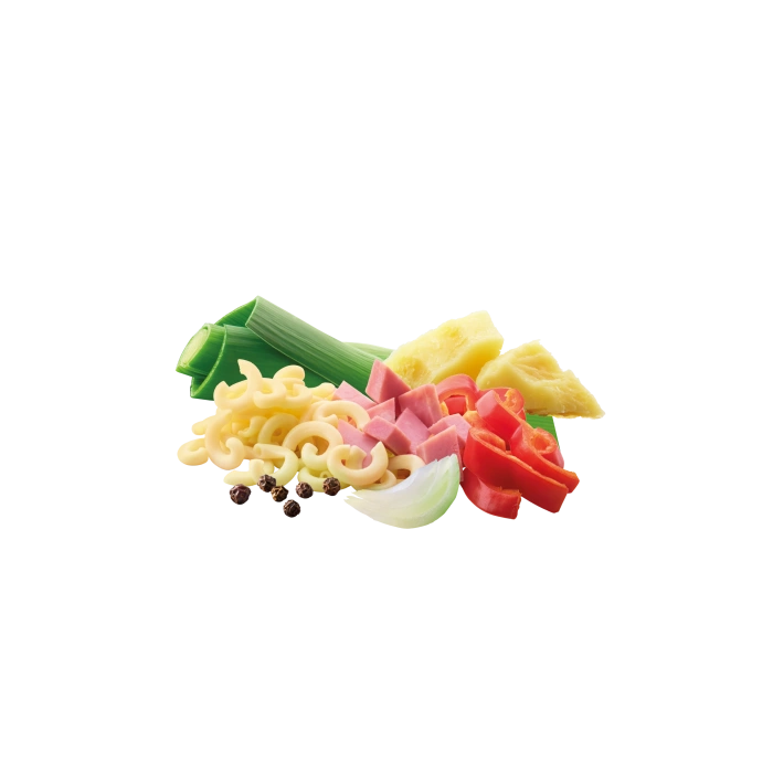 57% pasta (wheat, eggs, salt), 11% cheese powder (cheese, salt), 7% ham (pork, wheat starch, salt, acidity regulator (rosemary extract, citric acid), smoke flavor, preservative (E250)), milk powder, sunflower oil, potato starch, bell bell pepper (4%), onion (3%), leek (1%), glucose syrup, salt, bell pepper (0.07%).