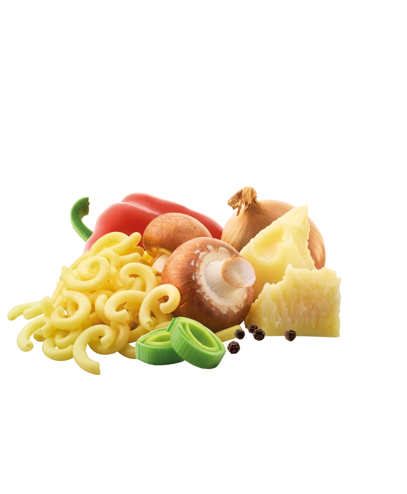 Pasta (57%) [wheat, eggs, salt], cheese powder (12%) [cheese, salt], milk powder, sunflower oil, potato starch, peppers (4%), onions (3%), mushrooms (2%), leek (1%), glucose syrup, salt, bell pepper (0.07%).