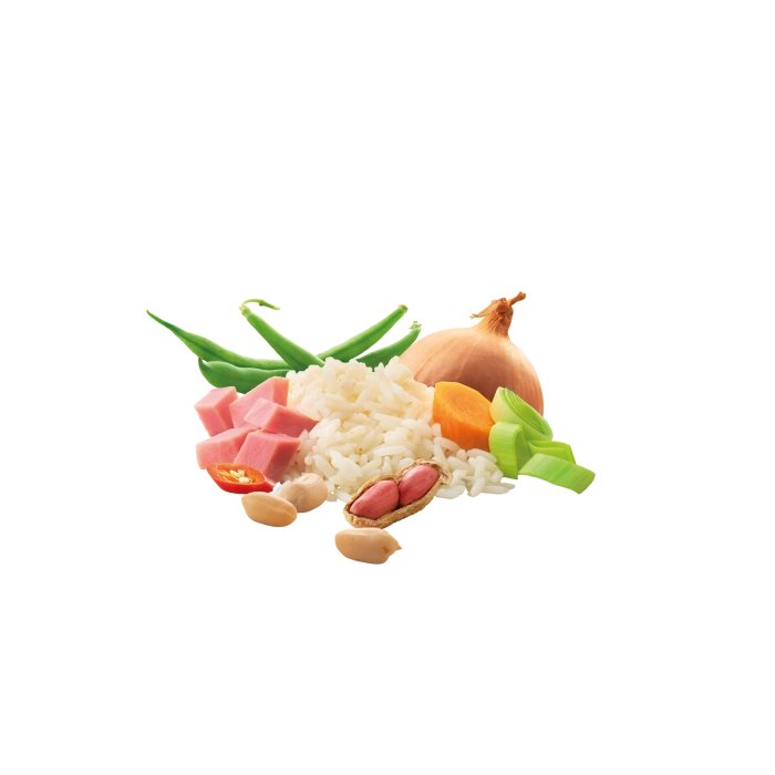 Rice (50%), 29% satay sauce (peanuts (40%), wheat flour, whey powder, sugar, onion (5%), salt, soybeans, lemongrass, yeast extract, chili peppers, garlic, cumin, maltodextrin, flavor, tomatoes, paprika, ginger powder, Chinese scoop, sunflower oil), 6% ham (pork, wheat starch, salt, acidity regulator (rosemary extract, citric acid), smoke flavor, preservative (E250)), sunflower oil, carrots (3%), green beans (3%), onions (2%), sugar, glucose syrup, salt, leek (0.65%), milk powder, ginger powder, hydrolyzed protein (corn, rapeseed), chili (0.03%), pepper.