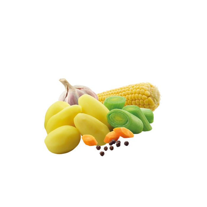 Potato powder (47%) [potato, emulsifier (E471), acidity regulator (citric acid), preservative (E222)], sunflower oil, soybean, milk powder, carrots (5%), corn (4%), leek (4%), hydrolyzed protein (corn, canola), glucose syrup, garlic (0.28%), pepper (0.09%).