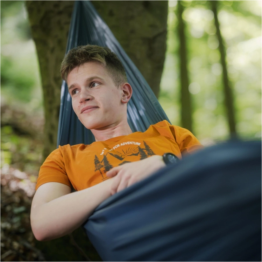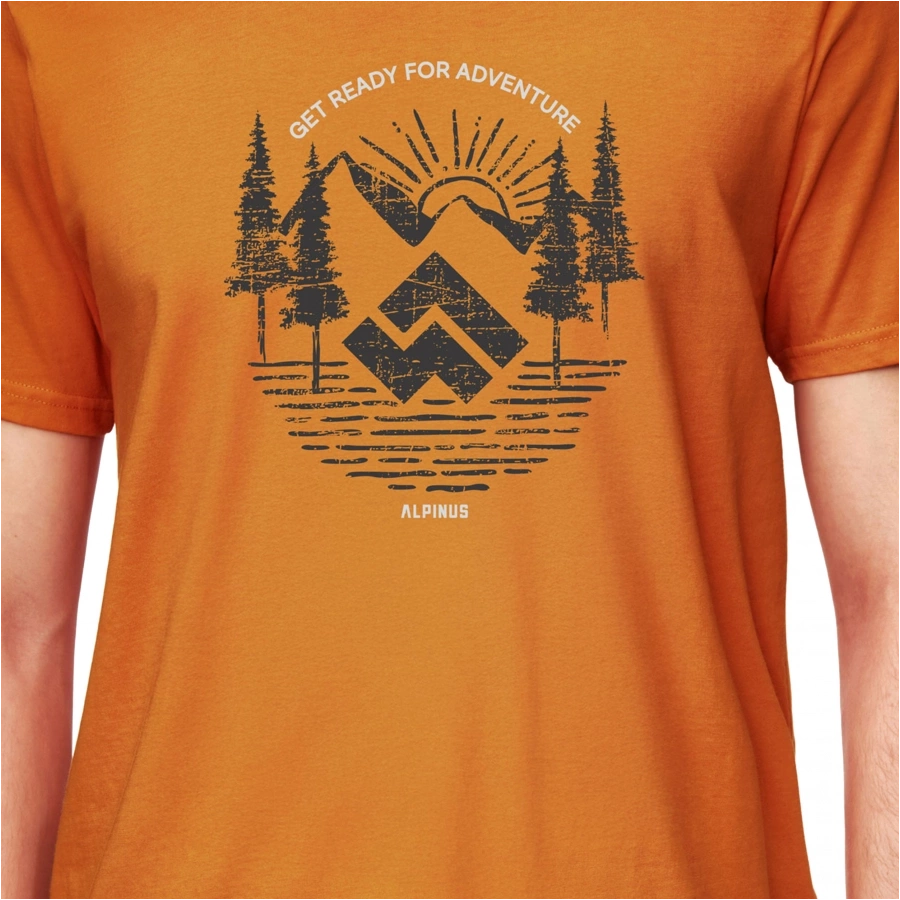 Feel the spirit of adventure every day! Alpinus Kitreli men's T-shirt is more than just an ordinary T-shirt - it's an invitation to the world of nature that you can always carry with you. The vibrant orange color and vivid print with motifs of mountains, sun and forest remind you that the real adventure begins when you move ahead.
