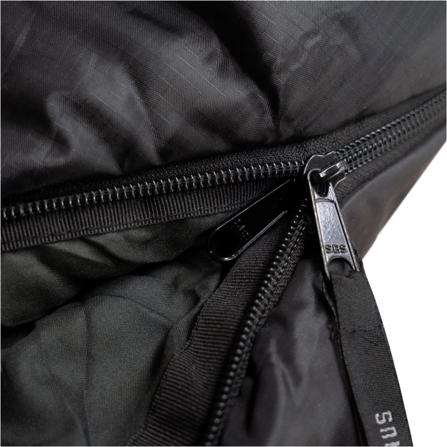 The "mummy" type shape has been anatomically shaped to fit the body, which improves thermal insulation. A special hood with a drawstring protects the head, and extra leg room increases sleeping comfort. Heavy-duty, two-way SBS zippers allow you to unzip from the bottom, which is useful when it's too hot at night.