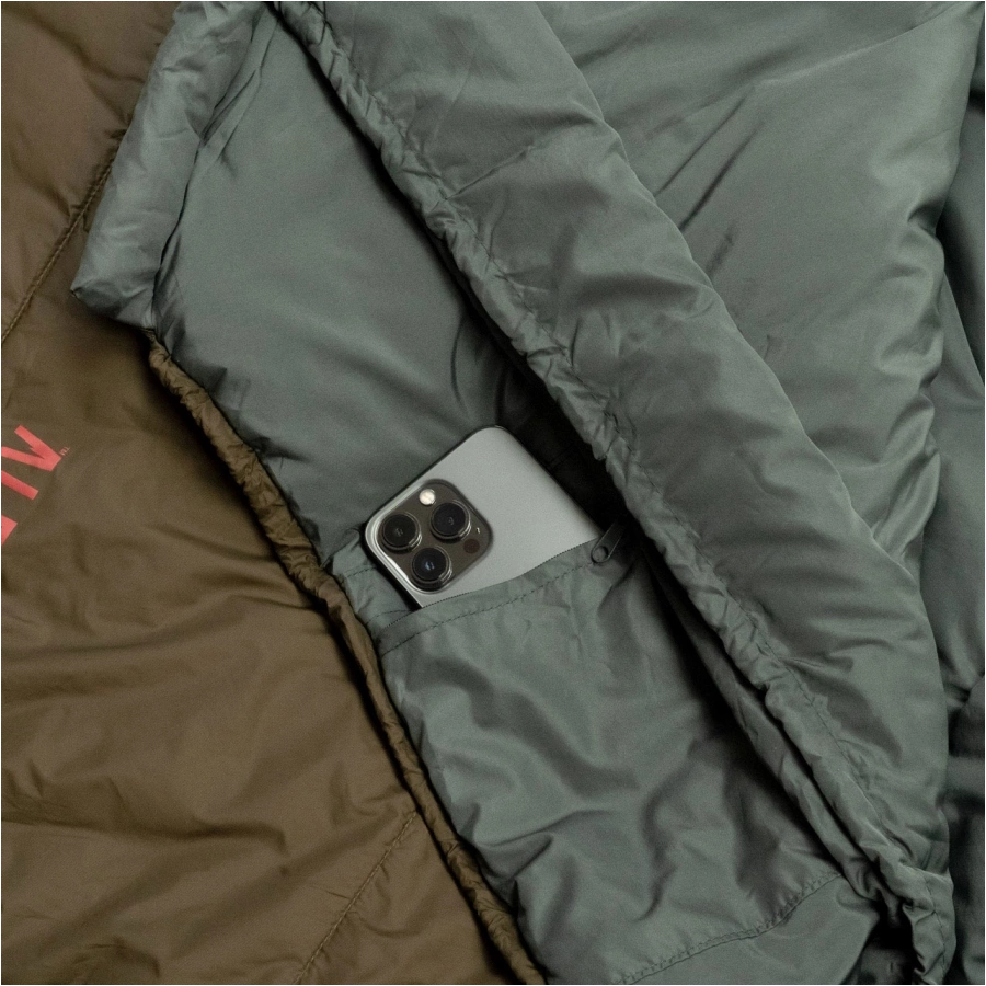The Survival 1300 was designed with convenience and practicality in mind. An internal zippered pocket allows you to safely store small items such as a wallet or phone. Two-way, heavy-duty YKK zippers allow you to unzip the sleeping bag from the bottom, which is useful when you want to cool your feet while sleeping. The entire length of the zipper is protected by an Anti Snag strip, which prevents the fabric from snagging during opening and closing. There is also a double Velcro pocket at head height to keep the sleeping bag from accidentally unzipping when you twist it while sleeping.