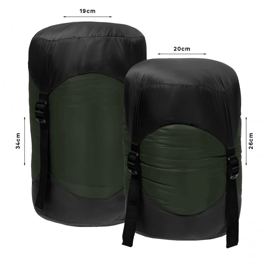 - Dimensions when packed: 34 × 19 cm (compression bag), after compression: 26 × 20 cm