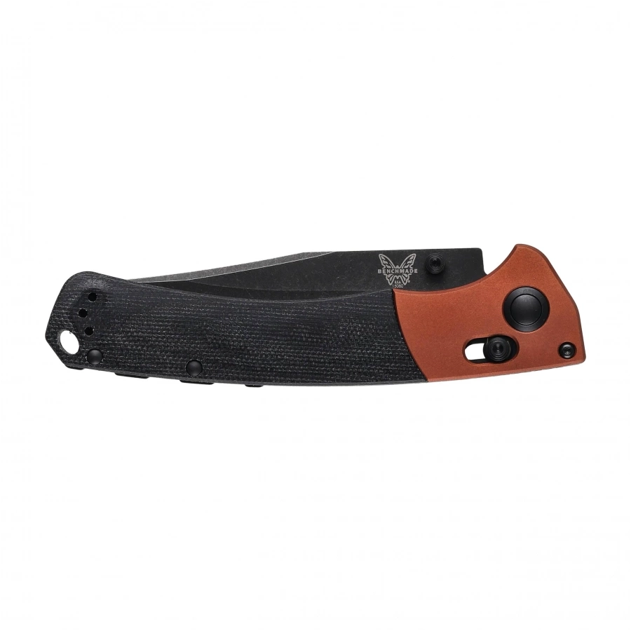 Handle made of anodized 6061-T6 aluminum with Micarta inserts offers a secure grip, moisture resistance, and exceptional aesthetics in a black-copper color scheme.