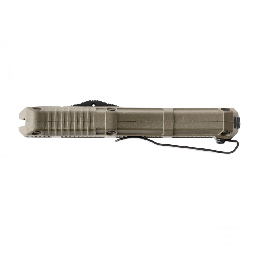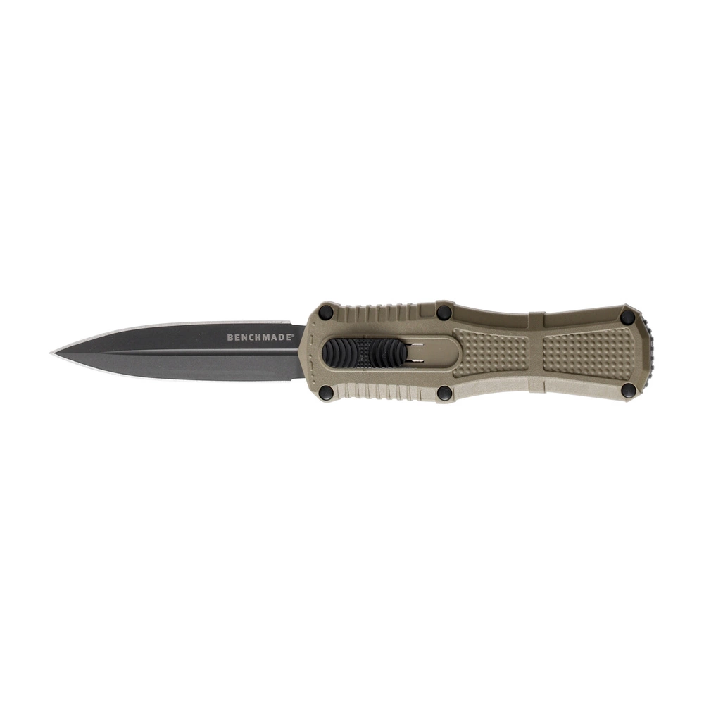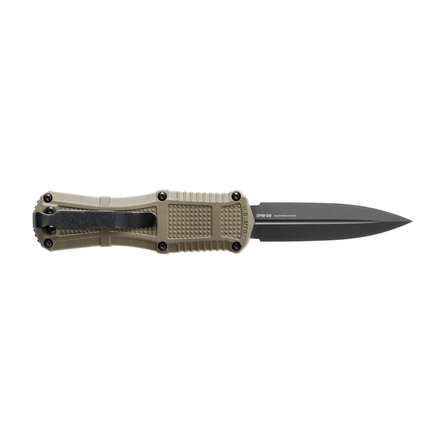 Automatic tactical knife featuring a D2 tool steel blade, a large deploy button and a Grivory composite handle with a non-slip texture. This is a smaller version of the popular and highly regarded Benchmade Claymore folder.
