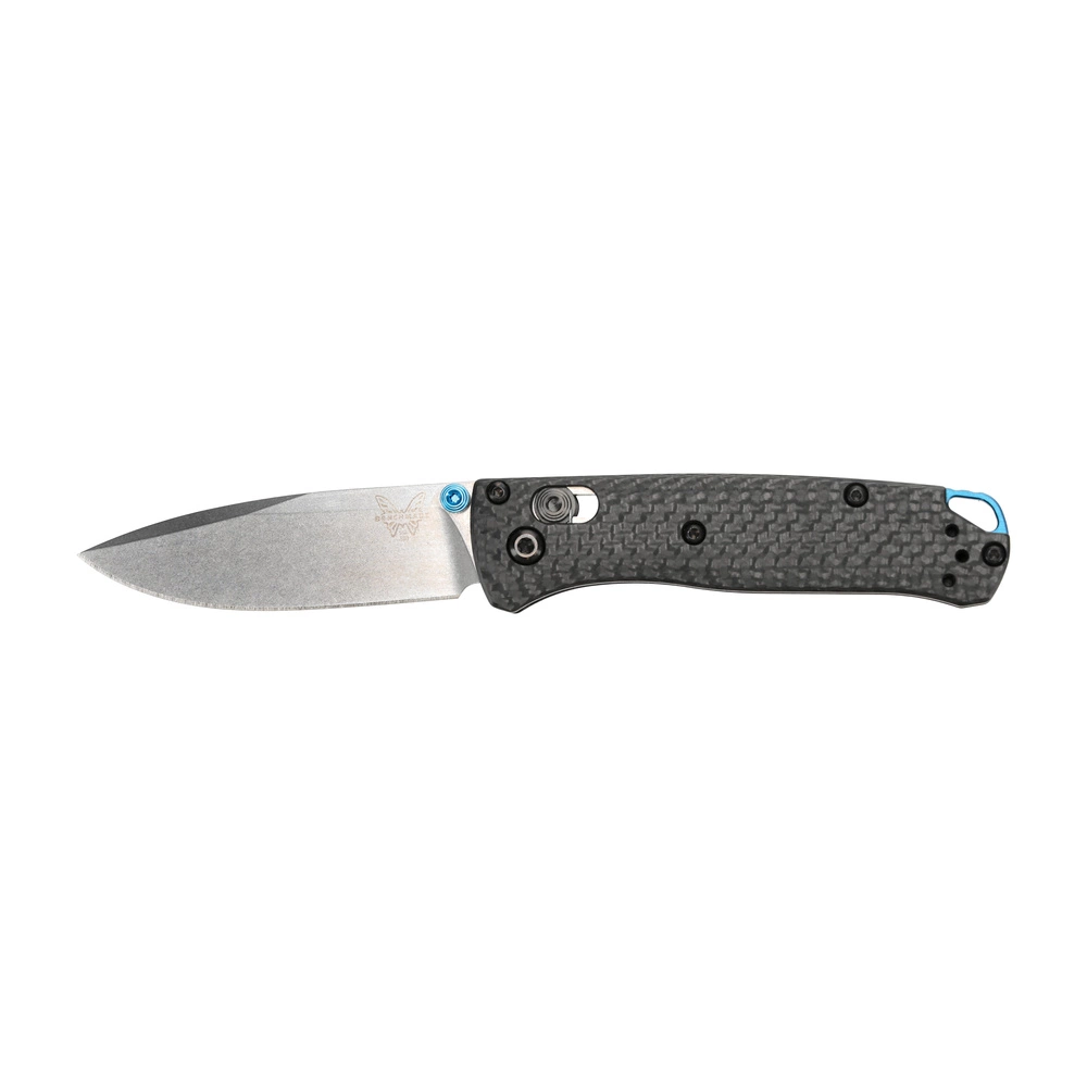 The Benchmade 533-3 Mini Bugout is a premium model, featuring a CPM-S90V super steel blade, milled carbon fiber facings and annotated blue accessories.