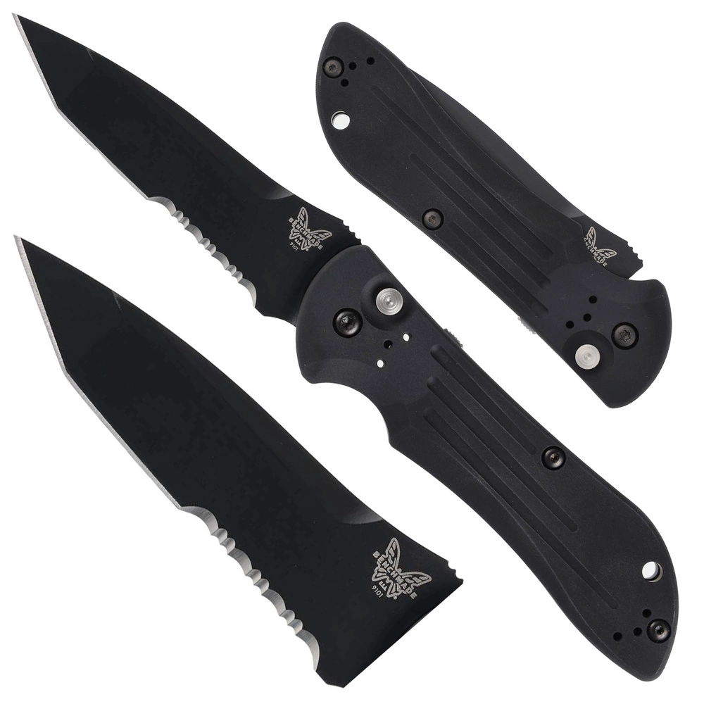 The Benchmade Auto Stryker 9101SBK is an automatic tactical knife featuring a partially serrated CPM 154 stainless steel blade, an enlarged deployment button and solid anodized aluminum liners.