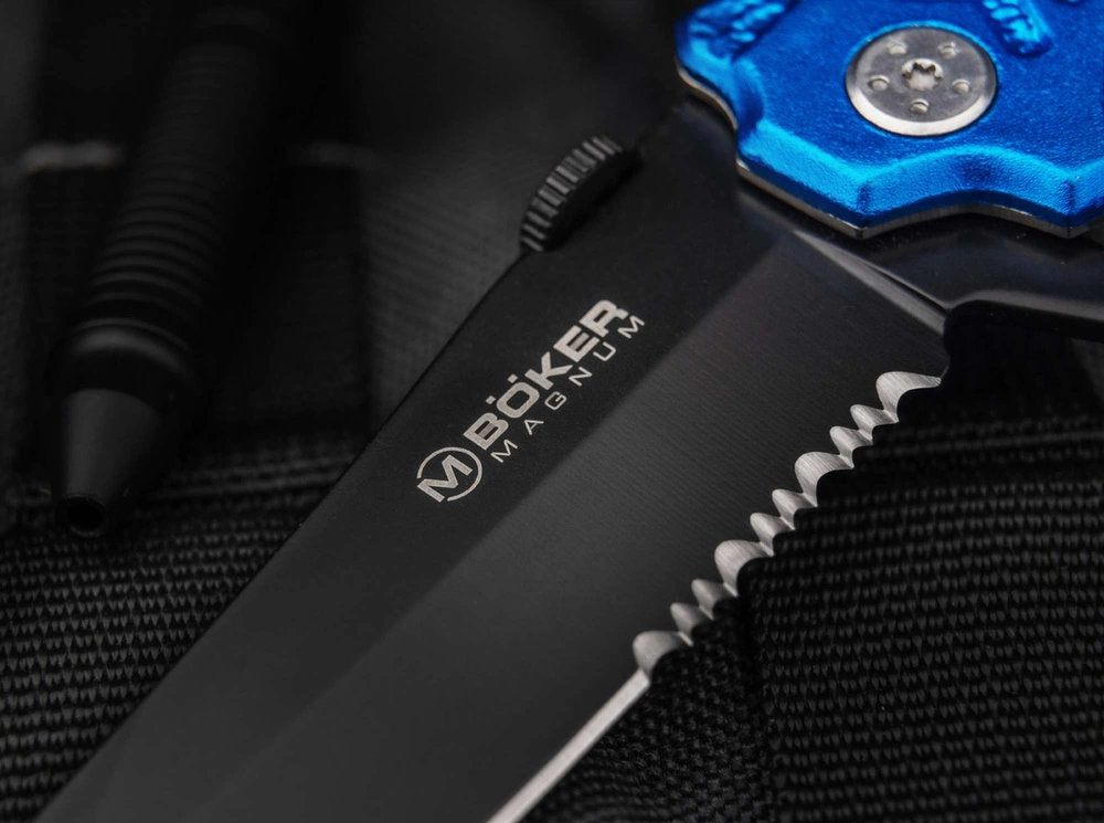 Anodized blue aluminum handle - ergonomic grip in all conditions, with firefighter emblem details.
