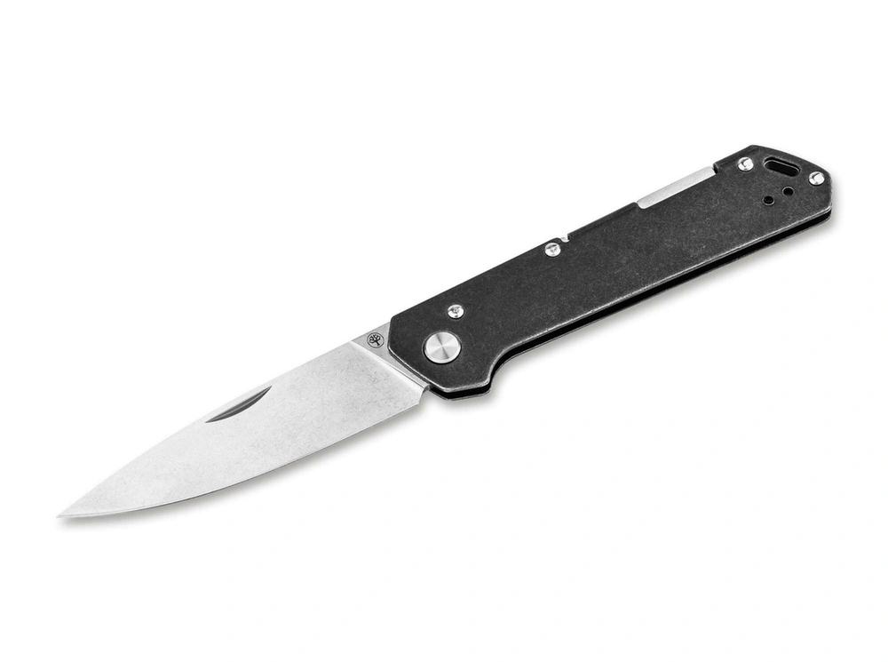 Handling concept with latch pin and backlock for opening and unlocking the blade is handled; iconic black stonewashed steel handle, assembled from a single piece. Available with lanyard hole, interchangeable tip-up clip and large utility.