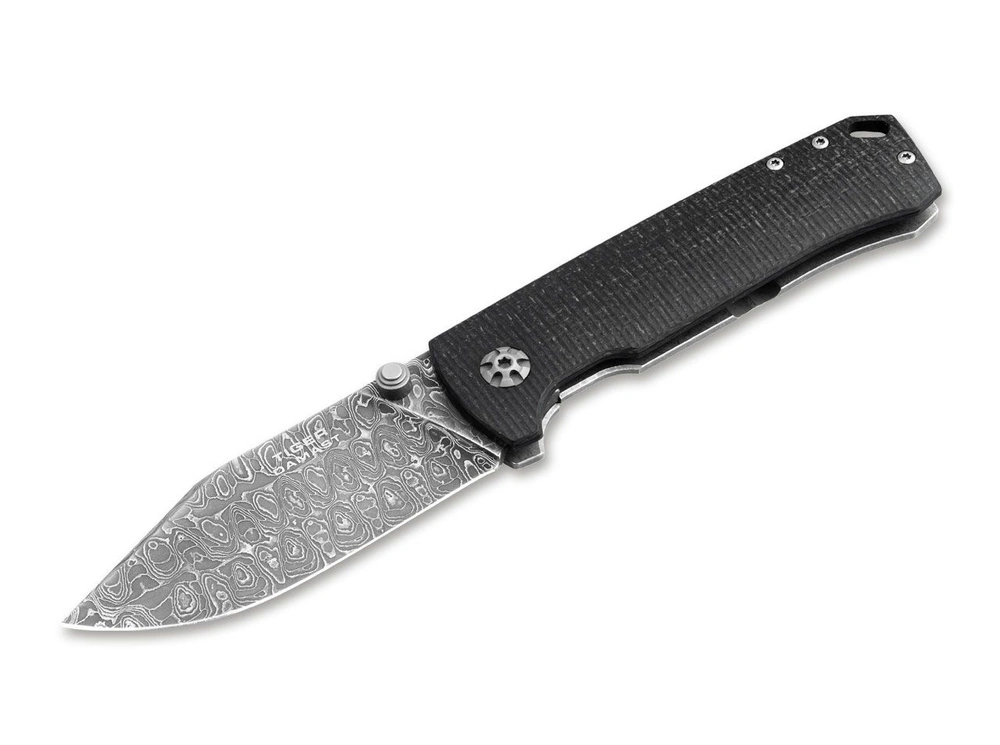The straight-edged Boker Tiger-Damask features a unique Damascus blade made from the steel of a battle tank destroyed in Bauska. The non-steel mosaic damask is hand-forged for us by Chad Nichols in the Fearless pattern and resembles the tank tracks left in the ground by Tiger's heavy tracks. Unlike traditional damascus, the production of damascus mosaic does not create layers, but the complex damascus bars are hand-formed into a mosaic in an intricate and highly complicated process. The ball-bearing blade is opened with a thumb stud and locked by a sturdy steel frame with a stonewash finish, while the Hinderer lock acts as a safety device to prevent over-extension of the lock. The overall shape of the knife follows the famous lines of the tank, and the decorative revolving bolt is modeled after the main drive wheel. Slightly contoured handle scales made of jute micarta have precisely milled grooves that recall the characteristic surface texture of the Zimmerit coating of German armored vehicles. With lanyard hole and milled clip (up/back) with steel ball. Handmade in the Boker Knife Manufacture in Solingen. Comes with elegant overhead display, certificate of authenticity and individual serial number.