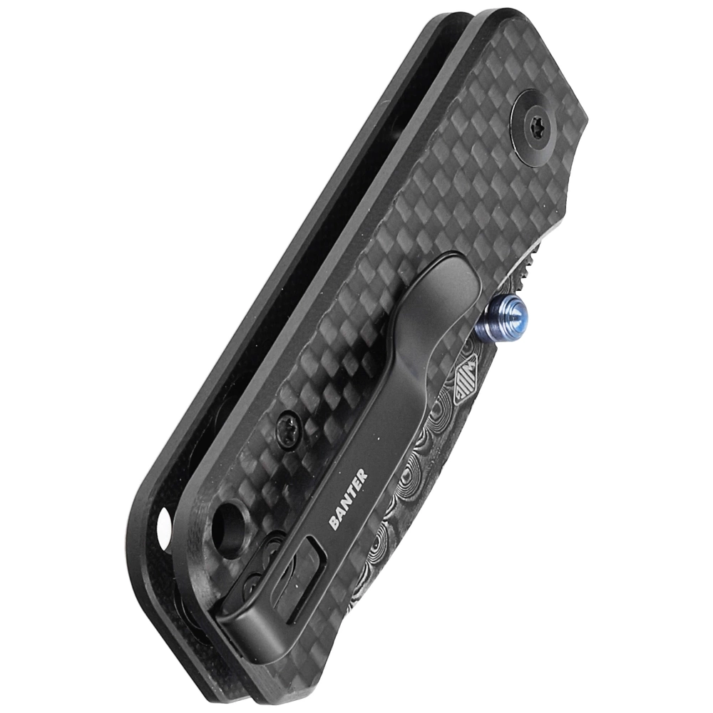 Product Name: Baby Banter Black Twill Carbon Fiber Overlay On Black G10, Black Hand Rubbed Damascus