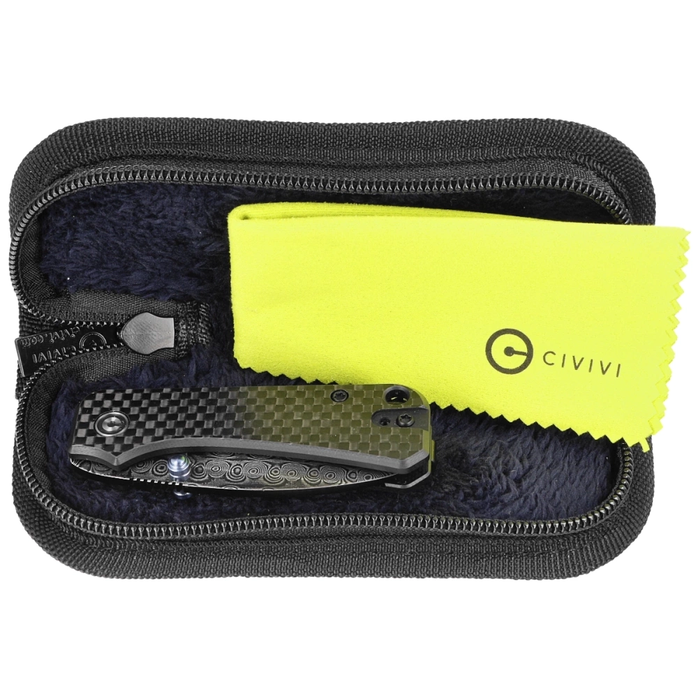 Handle - plastic covers G10 (glass fiber compressed under pressure with synthetic resin) laminated with carbon fiber (Carbon Fiber). Open design tzw. open-backed fixed to each other by steel sleeves spacers reduces weight and makes cleaning easier. Axis pivot is decorated with a stylized brand logo Civivi. Two-position left/right metal clip deep carry allows you to carry the knife discreetly in your pocket in the tip-up (blade tip up). On the back of the handle lanyard hole, cable hole.