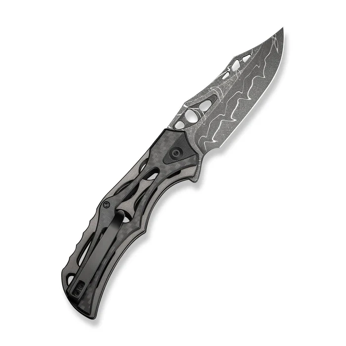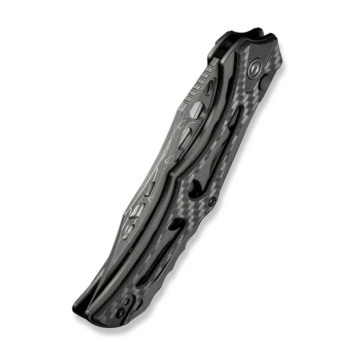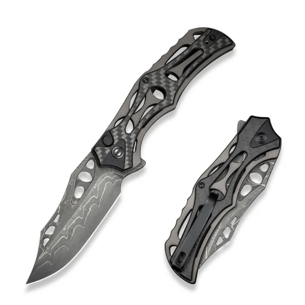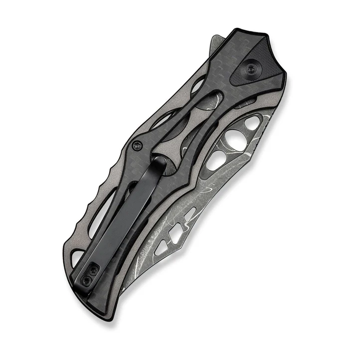 Handle - frame, made of aluminum, to which the heavily cut composite facings were screwed G10 covered with a layer of Twill Carbon Fiber. This gives the fingers plenty of support points for a firm grip. The fore finger groove made on the front improves ergonomics. Open design tzw. open-backed mounted with steel spacer sleeves reduces weight and makes cleaning easier. Simple, secure design provides assurance of many years of use. Thanks to all these design measures, the full-size folder reaches a staggering 75g in weight. Axis pivot is decorated with a stylized brand logo Civivi. Two-position (right/left), clip deep carry allows you to carry the knife discreetly in your pocket in the tip-up (blade tip up).
