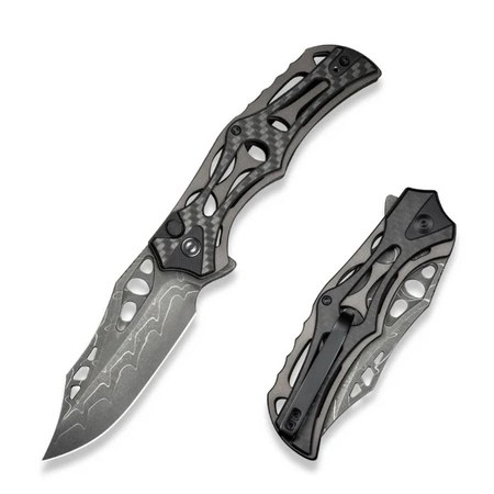 Head - type Clip Point with a gently marked belly, finished with acid etching to bring out the unique damask patterns. The small thickness of the blade, combined with the concave grind (Hollow Grind), gives excellent cutting edge geometry and extreme cutting performance. Long false blade increases penetrating properties of the blade. Ceramic ball bearings support the smooth operation of the opening mechanism of the wedge, which can be opened with a quick flipper flipper (index-finger flipper), a hole in the wedge (thumb hole) or by gravity. When opened, the fin forms a mini-garden preventing your hand from slipping on the blade. On the back of the wedge upper jimping, notched thumb rest. The whole thing is locked with a solid lock button lock. Under the lock button there is a resisting spring, which prevents accidental release of the lock.