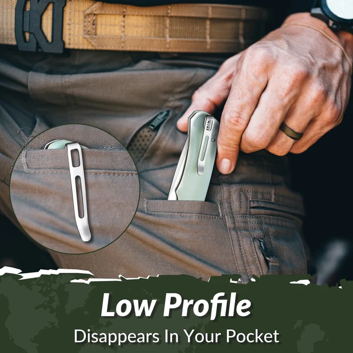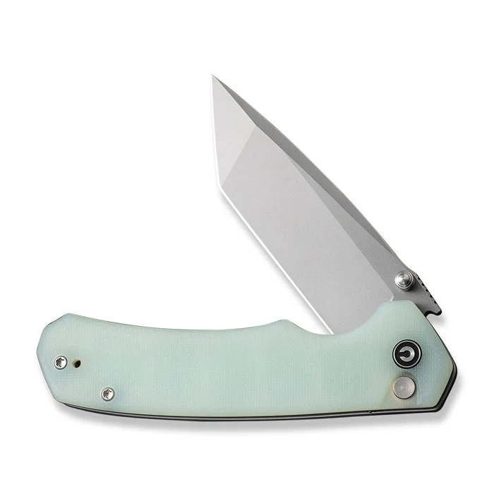Handle - facings of G10 (fiberglass compressed under pressure with synthetic resin) with a distinctive surface texture, which were bolted to steel liners. Contoured covers eliminate sharp edges for a comfortable and secure grip. Open design tzw. open-backed mounted with steel sleeves spacers reduce weight and make cleaning easier. Axis pivot is decorated with a stylized brand logo Civivi. Two-position, right/left clip deep carry allows you to carry the knife discreetly in your pocket in the tip-up (blade tip up).