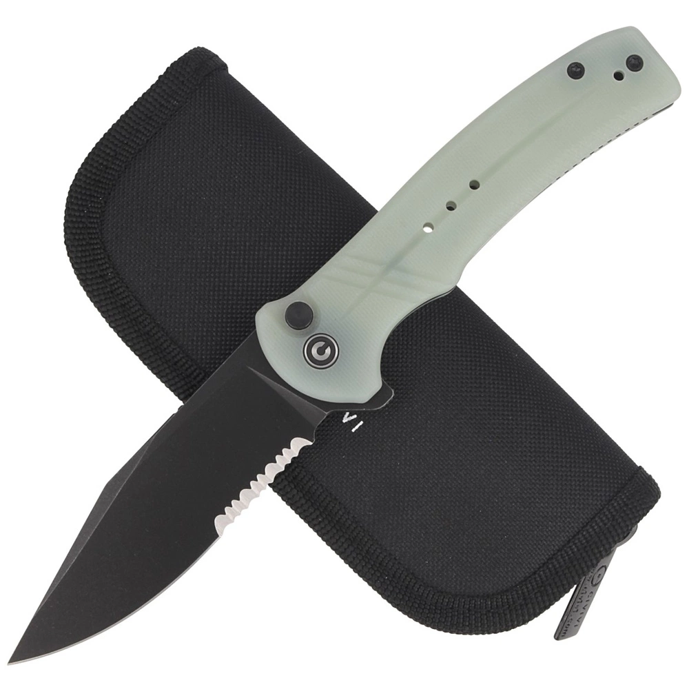 Handle - made of bright G10, glass fiber composite material pressed under pressure with synthetic resin. Chamfered cover edges eliminate sharp edges for comfort, and made on front and back on liners jimping improves grip security. Open design tzw. open-backed mounted with steel sleeves spacers reduce weight and make cleaning easier. Axis pivot is decorated with a stylized brand logo Civivi. Two-position, right/left clip deep carry allows you to carry the knife discreetly in your pocket in the tip-up (with the tip of the blade upwards).