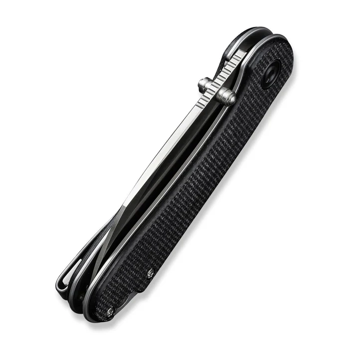 Handle - plastic facings Canvas Micarta, textured in an intricate "3D cube" pattern (Grabby Canvas Micarta) for improved grip security. All mounted to steel liners. In practice, this means many years of work without weakening the structure. Open design tzw. open-backed without the typical backspacer, attached with steel spacer sleeves for easy cleaning in the field. Axis pivot is decorated with a stylized brand logo Civivi. Right-side metal clip deep carry allows you to carry the knife discreetly in your pocket in the tip-up (blade up). Above the clip lanyard hole, oval cable opening.