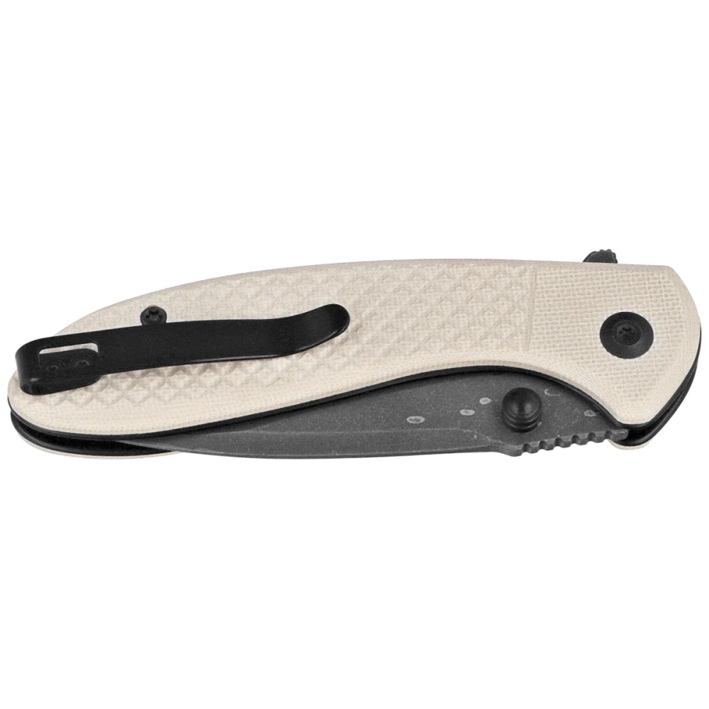 • Faeger Ivory G10, Damascus, compact EDC knife with Damascus steel head and textured G10 handle. Equipped with button lock and double opening system, it offers reliability and smooth operation for daily use.