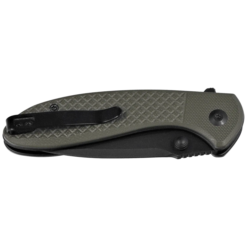 - Faeger OD Green G10, Black Stonewashed, compact EDC knife with 14C28N steel head and textured G10 handle. Equipped with a button lock and double opening system, it offers reliability for everyday use.
