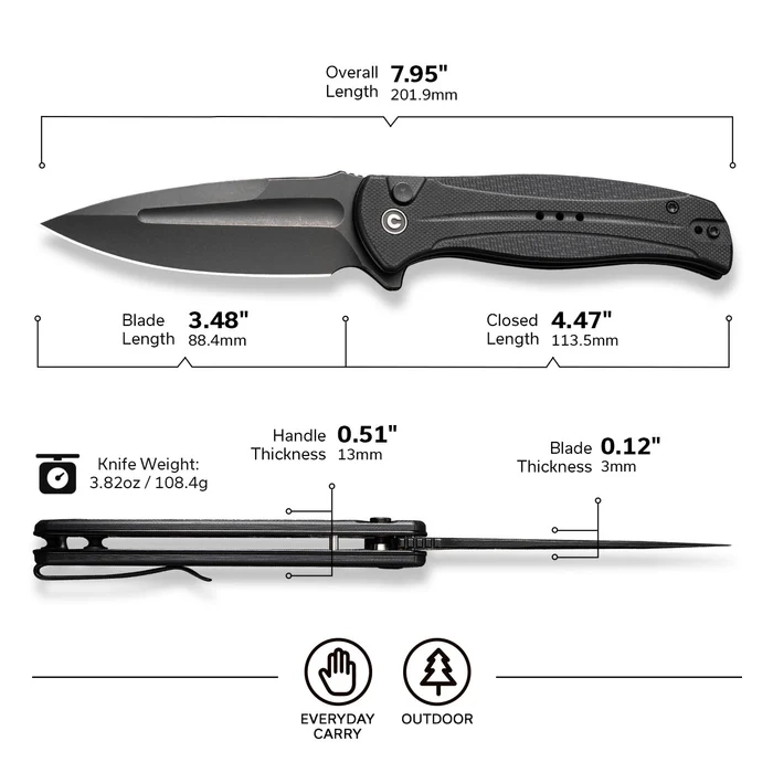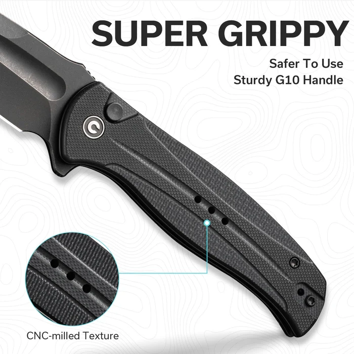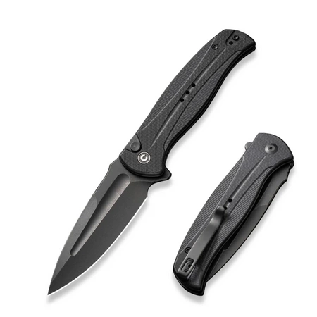 A large, versatile folding knife designed for easy carrying that meets all the utility requirements of a knife E.D.C. Stainless steel spear point blade Sandvik 14C28N. Intuitive locking Button Lock and ergonomic composite handle G10 and deep carry clip. Design made with the highest quality by Civivi.