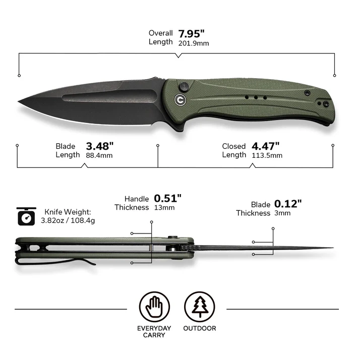 A large, versatile folding knife designed for easy carrying that meets all the utility requirements of a knife E.D.C. Stainless steel spear point blade Sandvik 14C28N. Intuitive locking Button Lock and ergonomic composite handle G10 and deep carry clip. Design made with the highest quality by Civivi.