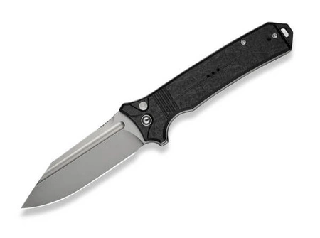 Blade - wide, Clip Point type, finished masking minor scratches with Black Stonewashed method. The small thickness of the blade, combined with a high, flat grind, gives excellent cutting edge geometry and extreme cutting performance. The long grain enhances the Blade's strength. Ball bearing ceramic supports the smooth operation of the blade's opening mechanism, which can be opened with a quick flipper (index-finger flipper). When opened, the flipper forms a mini-Guard to prevent the hand from slipping on the blade. On the back of the upper jimping wedge, a notched thumb rest. The entire blade is locked with a solid button lock. A spring is mounted under the lock button, providing enough resistance to avoid accidental opening.