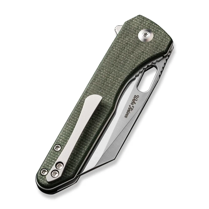 Handle - cladding of rough Canvas Micarta (pressure-pressed canvas with synthetic resin) with a distinctive surface texture, which were bolted to steel liners. Chamfered cover edges eliminate sharp edges for a comfortable and secure grip. Robust Canvas Micarta backspacer provides the desired rigidity and structural strength. Simple, secure design provides assurance of many years of use. Axis pivot is decorated with a stylized brand logo Civivi. Single-position, right-hand clip deep carry allows you to carry the knife discreetly in your pocket in the tip-up (blade tip up).