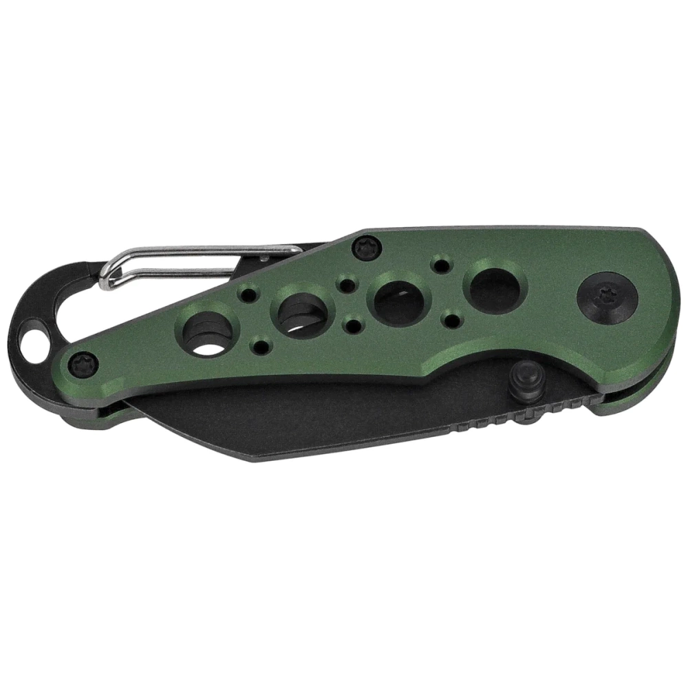 Pragma Green Aluminum, Black Stonewashed all-purpose folding knife designed for easy portability that meets all the utility requirements of an E.D.C. knife. Wharncliffe blade in Nitro-V stainless steel . Button Lock for push-button gravity opening of the blade and an ergonomic aluminum handle. Finished with a stainless steel snap hook allowing you to clip it to your pants belt loop or to the straps on your backpack The compact size of this tool will allow you to take it with you everywhere!
