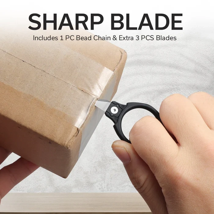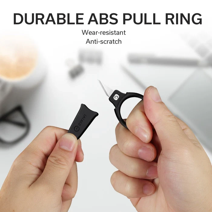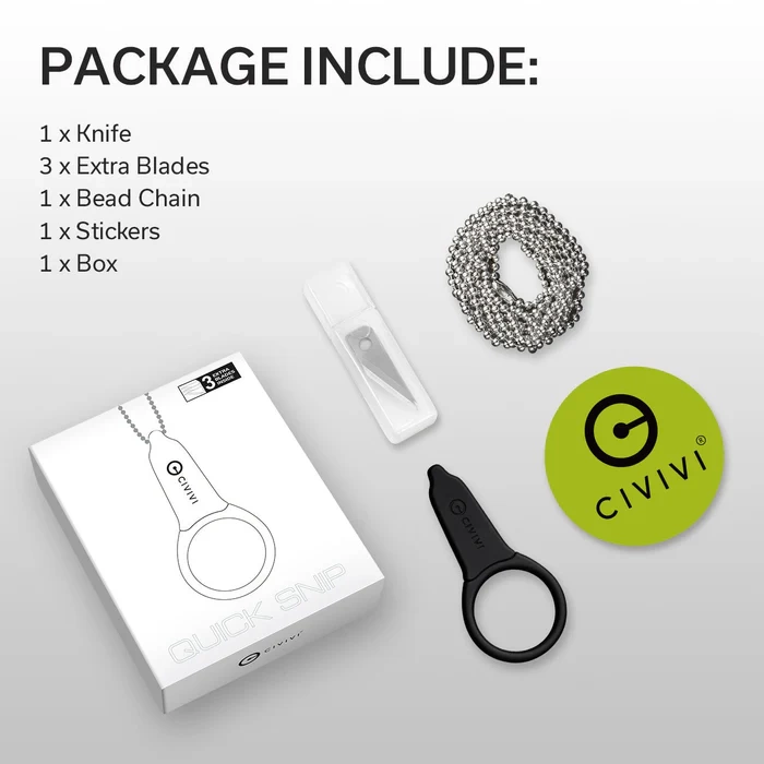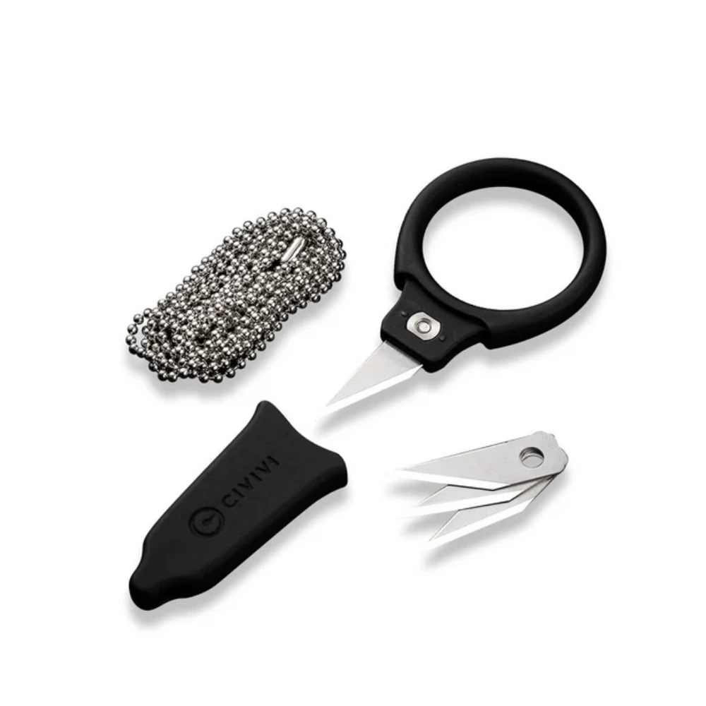 • Quick Snip Black ABS/Rubber Coating, 6Cr13, small neck knife with interchangeable blade. Finger ring handle is ABS composite covered with rubber, replaceable blades (4 included) are made of 6Cr13 stainless steel. Scabbard and chain included.