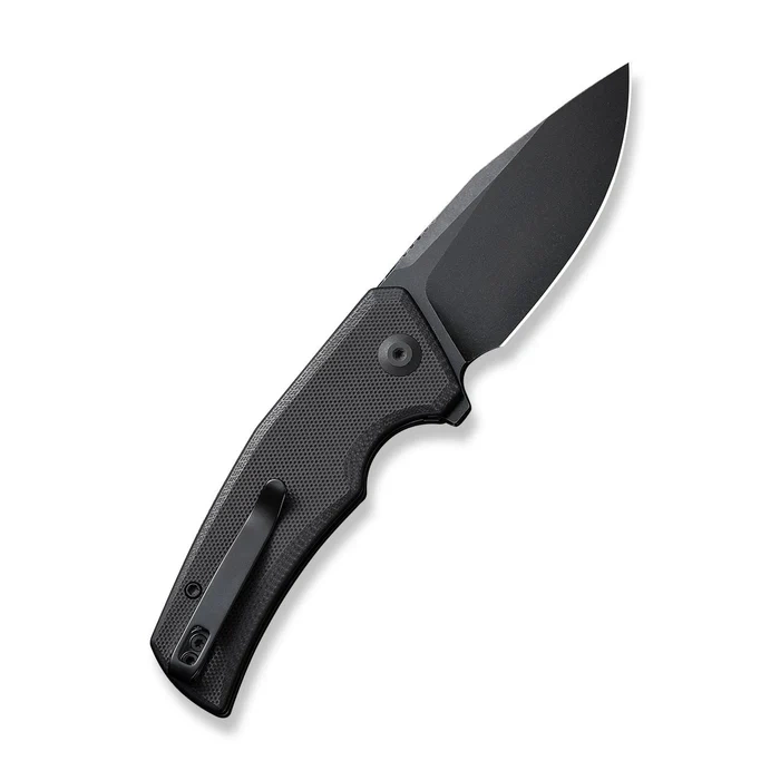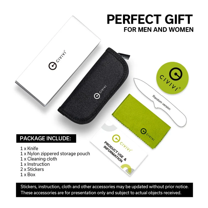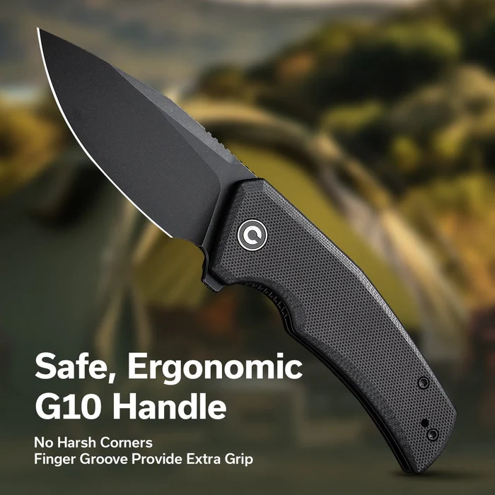 Handle - made of rough composite G10, fiberglass compressed under pressure with resin. Chamfered cover edges eliminate sharp edges for comfortable grip. Open design tzw. open-backed mounted with steel spacer sleeves reduces weight and makes cleaning easier. Finger undercut (fore finger groove) improves grip security. The pivot axis is decorated with a stylized Civivi brand logo. Two-position, right/left deep carry clip allows you to carry the knife discreetly in your pocket in the tip-up position tip-up (blade tip up).