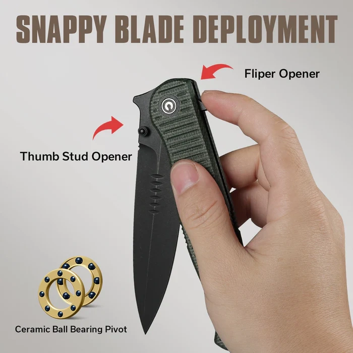 Handle - made of composite Canvas Micarta. The chamfered edges of the covers eliminate sharp edges for comfort, while the fore finger groove and vertical notches on the handle surface improve grip security. Robust G10 backspacer provides the desired rigidity and structural strength. Simple, secure design provides assurance of many years of use. Axis pivot is decorated with a stylized brand logo Civivi and decorative ring around pivot the so-called pivot collar made of black G10. Single-position (right), wide clip deep carry allows you to carry the knife discreetly in your pocket in the tip-up (blade tip up).