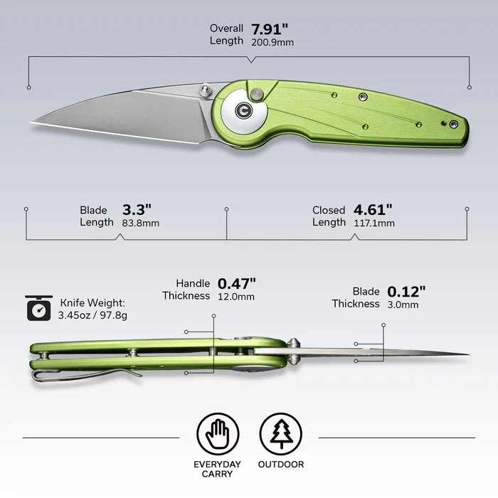 Handle - lime green. Made of polished aluminum, whose beveled cover edges eliminate sharp edges for comfort, and the fore finger groove made on the front improves grip security. Open design tzw. open-backed mounted with steel sleeves spacers reduce weight and make cleaning easier. Axis pivot is decorated with a stylized brand logo Civivi. Two-position, right/left clip deep carry allows you to carry the knife discreetly in your pocket in the tip-up (blade tip up).