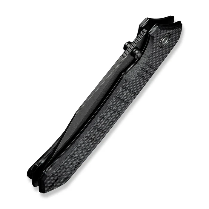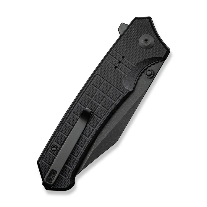 Handle - made of rough composite G10, fiberglass compressed under pressure with resin. Chamfered cover edges eliminate sharp edges for comfortable grip. The surface has been engraved with a "frag pattern". Open design tzw. open-backed mounted with steel spacer sleeves reduces weight and makes cleaning easier. Finger undercut (fore finger groove) improves grip security. The pivot axis is decorated with a stylized Civivi brand logo. Two-position, right/left deep carry clip allows you to carry the knife discreetly in your pocket in the tip-up position tip-up (blade tip up).