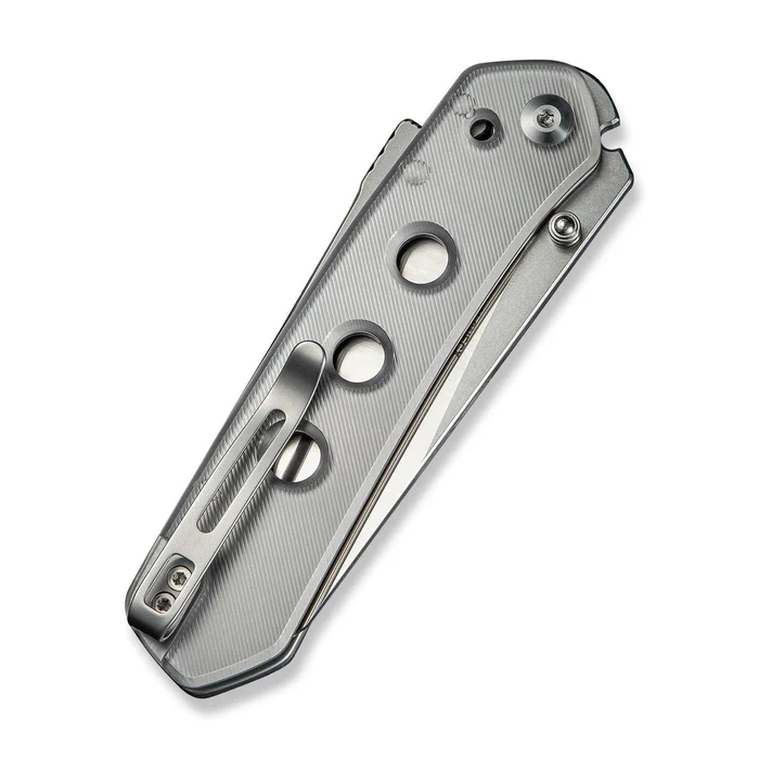 Handle - chamfered facings of polished, transparent plastic Lexan, attached to liners stainless steel. The simplicity and robustness of the design provide assurance of many years of use. The handle has been relieved by a series of holes in the center of the facings. Clip twopositional (right/left) allows the knife to be carried in tip-up position. In the rear part there is hole for threading safety or decorative cable. As in other models, the pivot axis is decorated with a stylized manufacturer's logo.