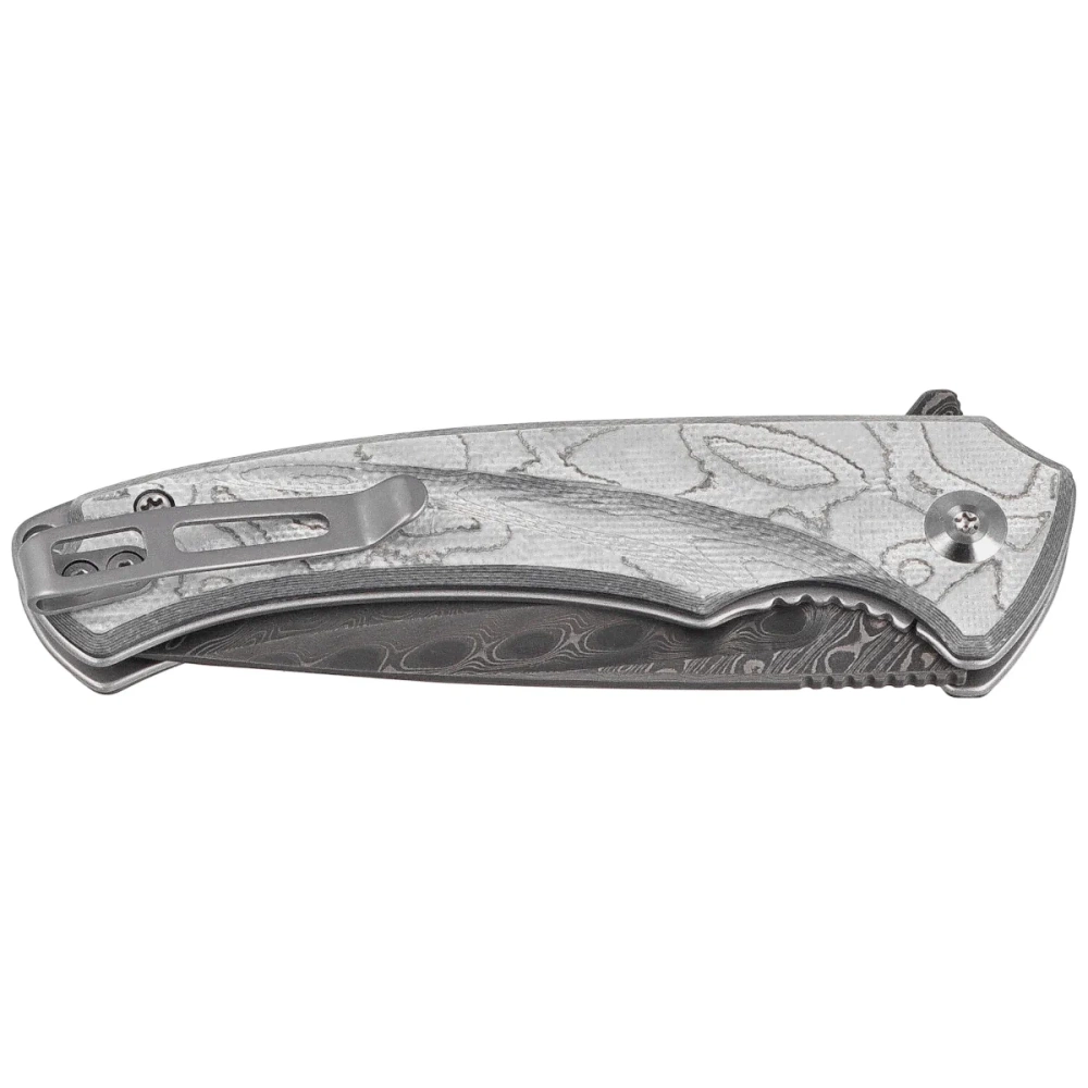 • Voidflare G10 w/ Aluminum Foil, Damascus - an elegant EDC folding knife with a sharp and durable damascus head, set on a lightweight and textured G10 composite handle. Silver details and dynamic lines highlight the modern style.
