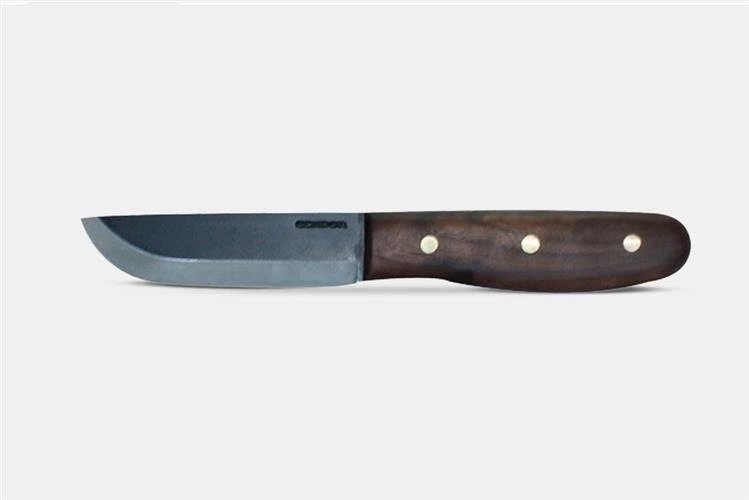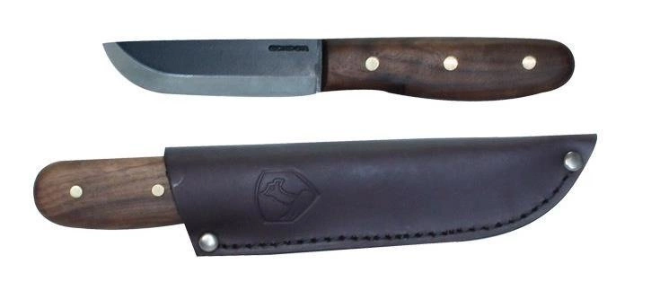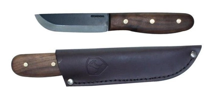 The Bushcraft Basic 4" knife is a scaled-down version of the Bushcraft basic 5" knife. The knife has a full-tang construction. The knife's 3 mm thick head is made of 1075 carbon steel with a dark epoxy coating. The handle of the knife is made of American walnut hardwood. Handle reinforced with three brass pins.