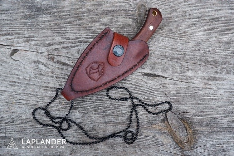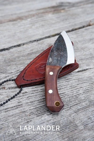 The name of the Pangui knife is inspired by the claw of a puma. People from"Mapuche," also known as "Araucanos," the people of Chile, in their original language "Mapudungún," referred to the puma as "Pangui". Designed by Walter A Matthews, the neck knife features a natural finish high carbon steel blade, walnut wood wraps and a hand-finished special leather scabbard with ball chain. The knife fits well in the hand, is compact and at the same time you can feel the power inherent in the eight-centimeter blade with a thickness of 3 mm. The scabbard is an excellent accessory that not only protects the knife well but, thanks to its successful design and great finish, emphasizes the uniqueness and style of the knife.