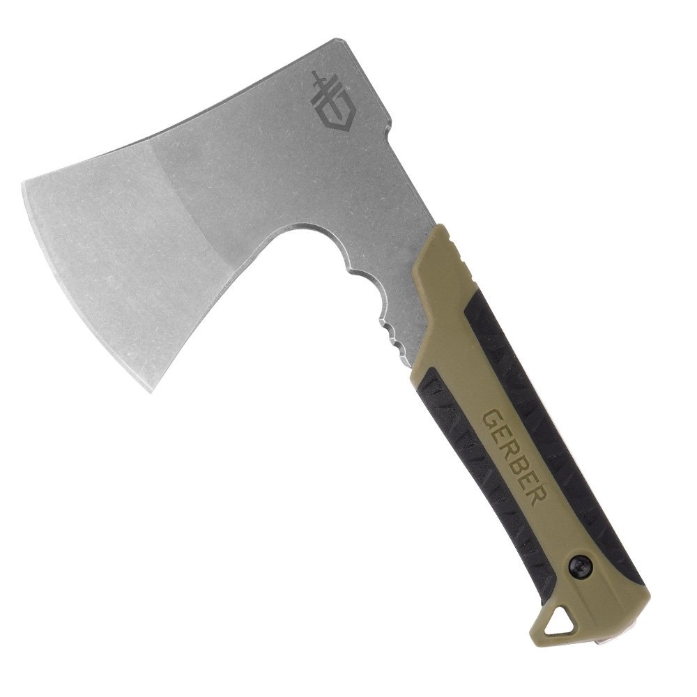 Gerber Pack Hatchet flat is a practical, compact axe for camping applications.