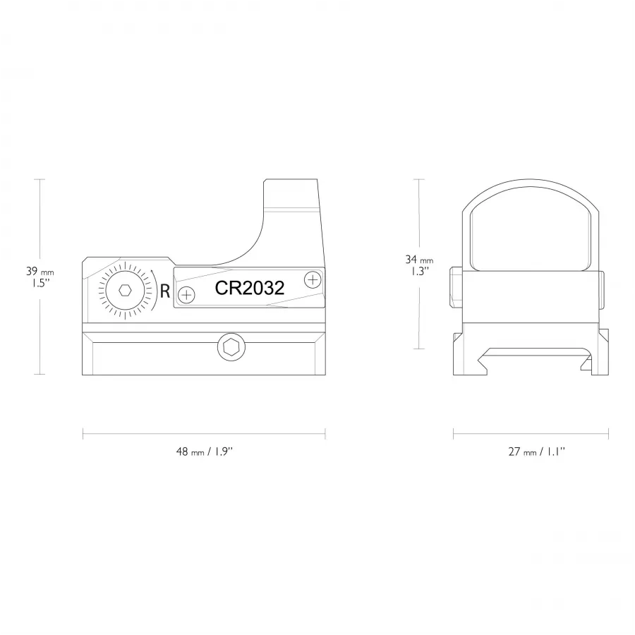 Equipment: low Weaver rail mount, rubber boot, allen keys, flathead screwdriver, optics cleaning cloth, CR2032 battery