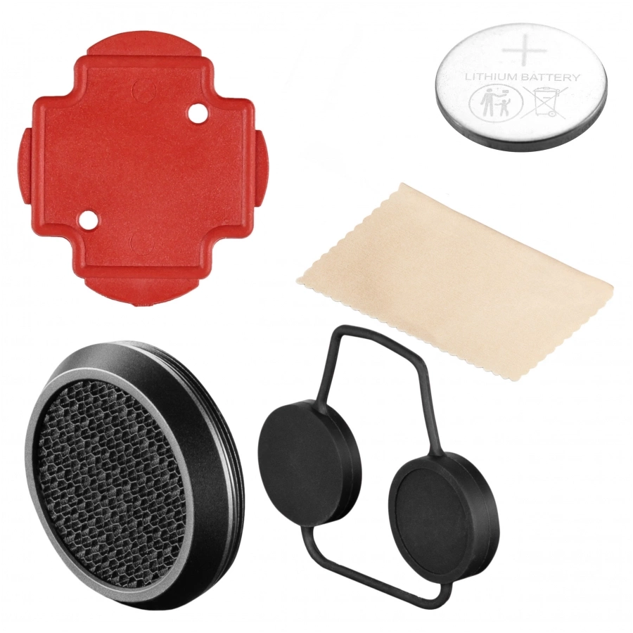 Equipment: rubber lens cover (bikini), Kill Flash cover, allen wrench, optics cleaning cloth, CR2032 battery