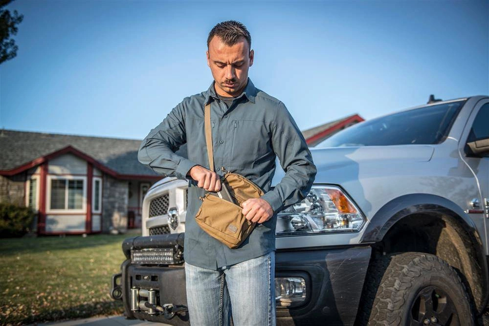 Made of 500D Cordura and equipped with an adjustable shoulder strap, this small, comfortable and durable bag easily holds most of the items you need on a daily basis: smartphone, tablet, keys, notepad, wallet, including full-size guns.