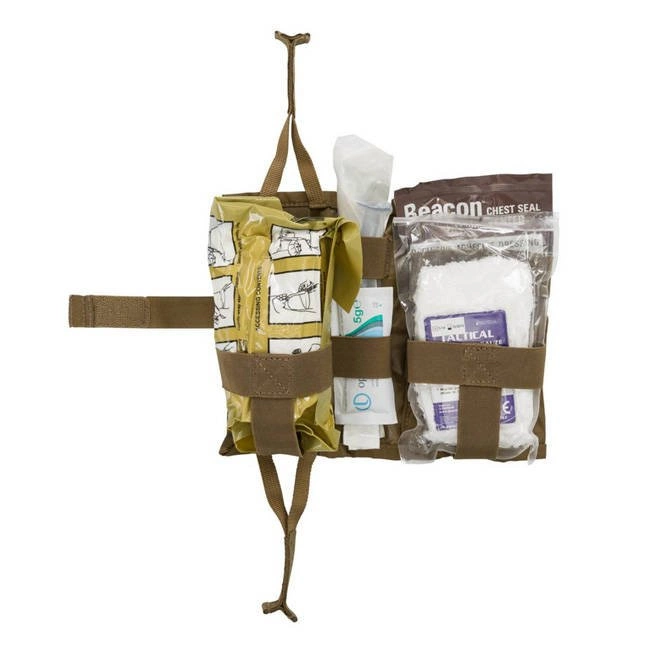 The Med Kit® pocket is equipped with mounting compatible with MOLLE/PALS system, as well as belt loops with a maximum width of 50 mm. It can be worn both vertically and horizontally. Velcro panel on the front allows for easy personalization. After removing the inner liner, it can be used to carry a stasis.