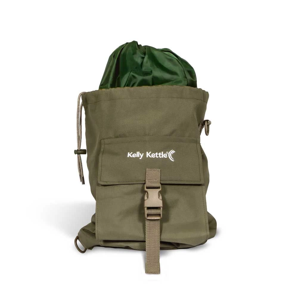 Durable green bag with shoulder strap for carrying the entire Kelly Kettle set. This bag is large enough to easily hold our largest "Base Camp" model and all the accessories that make up the kit. Bag features include: