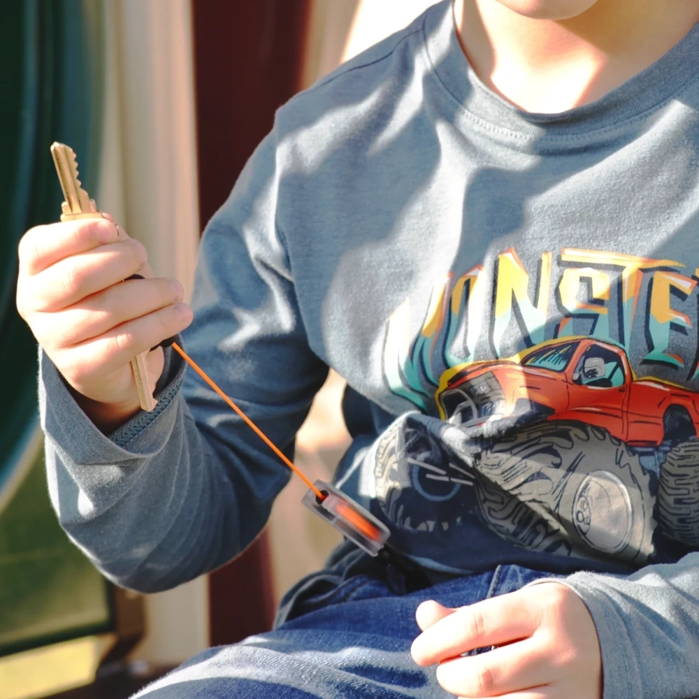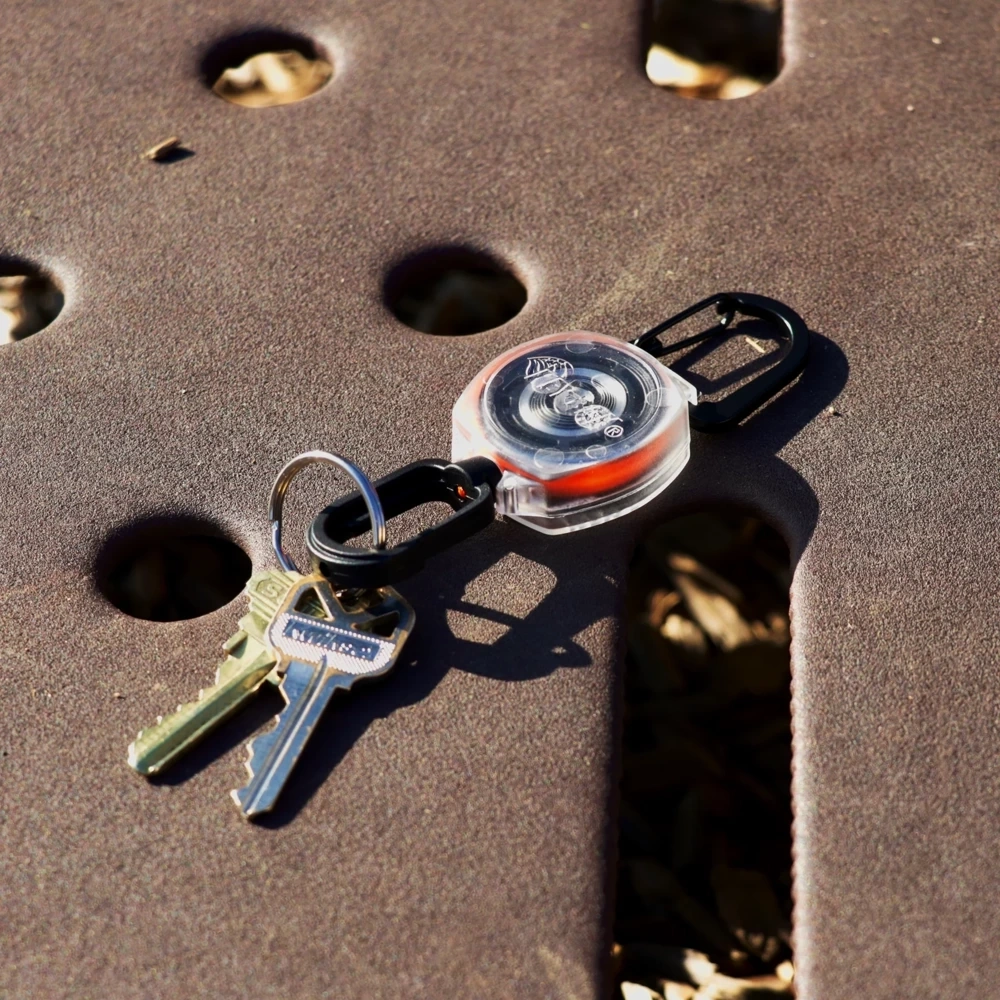 Compact retractor in a modern design. The use of a transparent case and brightly colored cord creates an easily identifiable device on which to carry keys, for example. The retractor itself can easily be hooked up to the popular D-Rings in backpacks. Clipping in is done with an aluminum snap hook, and items can be held on the polymeric. Surely it attracts back the objects pulled away.