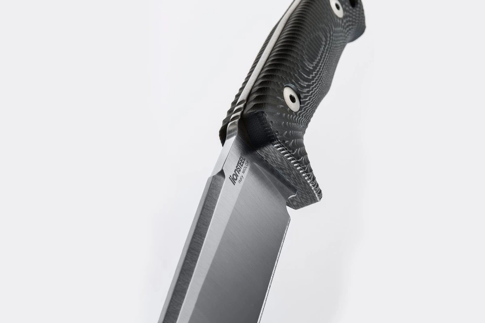 Handle - made with Solid®, obtained from a unique block (one piece) of waterproof Micarta. As a result, a monolithic skeleton (body) of the highest strength was obtained, which is a strong, solid structural element. Grip facings have been machined 4D obtaining an anti-slip texture with excellent adhesion. Enlarged protrusion acts as a gut protecting the hand from slipping on the blade. Arbor with lanyard hole, hole for the rope, it can also function as a hammer.