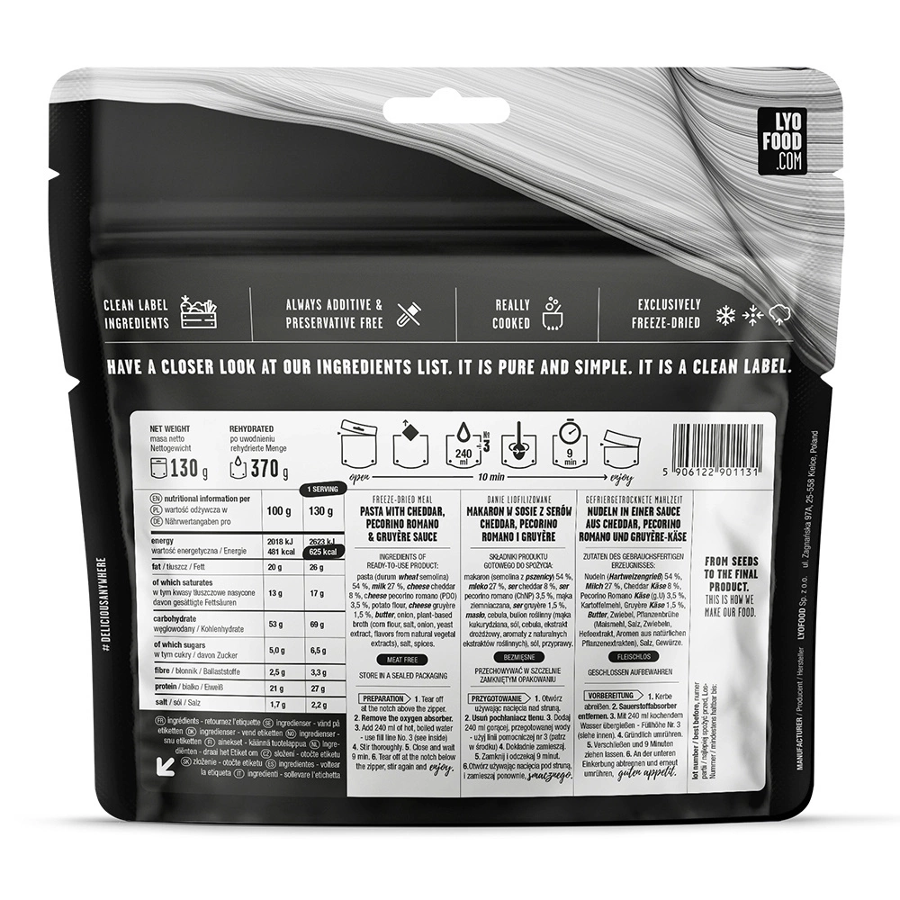 There will be no disappointments - Mac & Cheese is a classic of the genre, but in our edition it is far from a cliché. Wanting to give you a unique taste experience when you are far from your favorite restaurant we reached for three different cheeses. Classic Cheddar accompanied by Pecorino Romano and Gruyère create a creamy sauce in which we bathed the wheat pasta. LYO Mac & Cheese will easily turn any outdoor dinner into an exciting cheese feast.