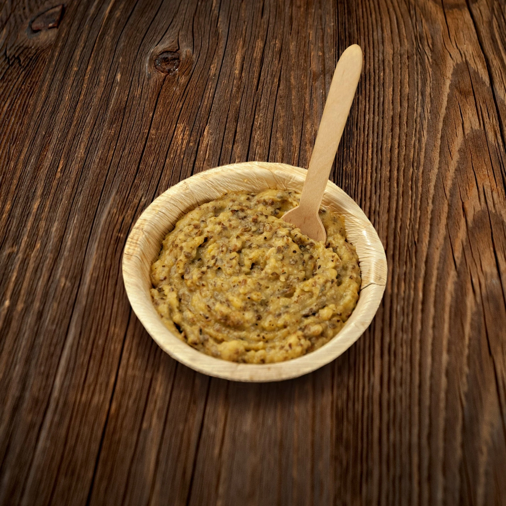 Method of preparation: 1. Open the zipper bag using the notch. 2. Remove the oxygen absorber. 3. Add hot, boiled water in the amount described on the package (or to the line inside the package) 4. Stir thoroughly. 5. Close and wait 9 minutes. 6. Open the bag and stir again - the meal is ready to eat