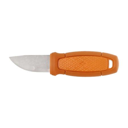 Mora Eldris Neck Knife Burnt Orange with rope, flint and clasp. Eldris Neck Knife is a versatile, finely finished, handy and sharp knife that can be worn around the neck. The blade of the Mora Eldris knife has a 2.0 mm thick and is made made of the classic Sandvik 12C27 stainless steel for Scandinavian knives.