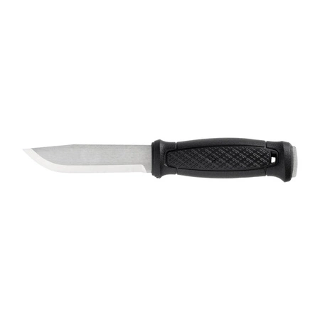 The design of the Mora Garberg knife is typical of a bushcraft knife i.e. fulltang blade, Scandinavian cut and a simple, comfortable handle, which is made of polyamide. Thanks to its textured surface and properly contoured surface, the knife fits perfectly in the hand and provides comfort regardless of position.The back of the knife is ground and has a sharp edge which allows you to flinting a fire using a flint. The head protruding from the back of the handle is perfect for scraping such as kindling, crushing or as a knockout. The blade of the Mora Garberg knife has a 3.2 mm thick and is made of made of high-grade Sandvik 14C28N stainless steel with increased hardness and corrosion resistance.